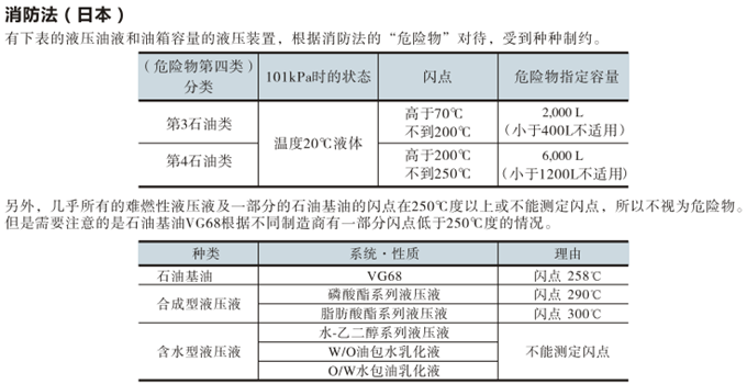 有下表的液壓油液和油箱容量的液壓裝置,根據(jù)消防法的“危險(xiǎn)物”對(duì)待,受到種種制約。