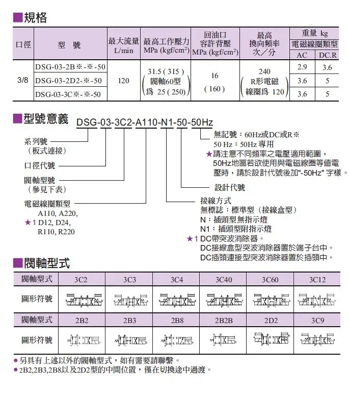 1、電磁閥符號(hào)及其表示含義如下: 此外,三位四通電磁換向閥型號(hào)有DSG-02-3C2,DSG-02-3C3,DSG-02-3,DSG-02-3C5,DSG-02-3C6,DSG-02-3C60,DSG-02-3C7,DSG-02-3C8,DSG-02-3C9等